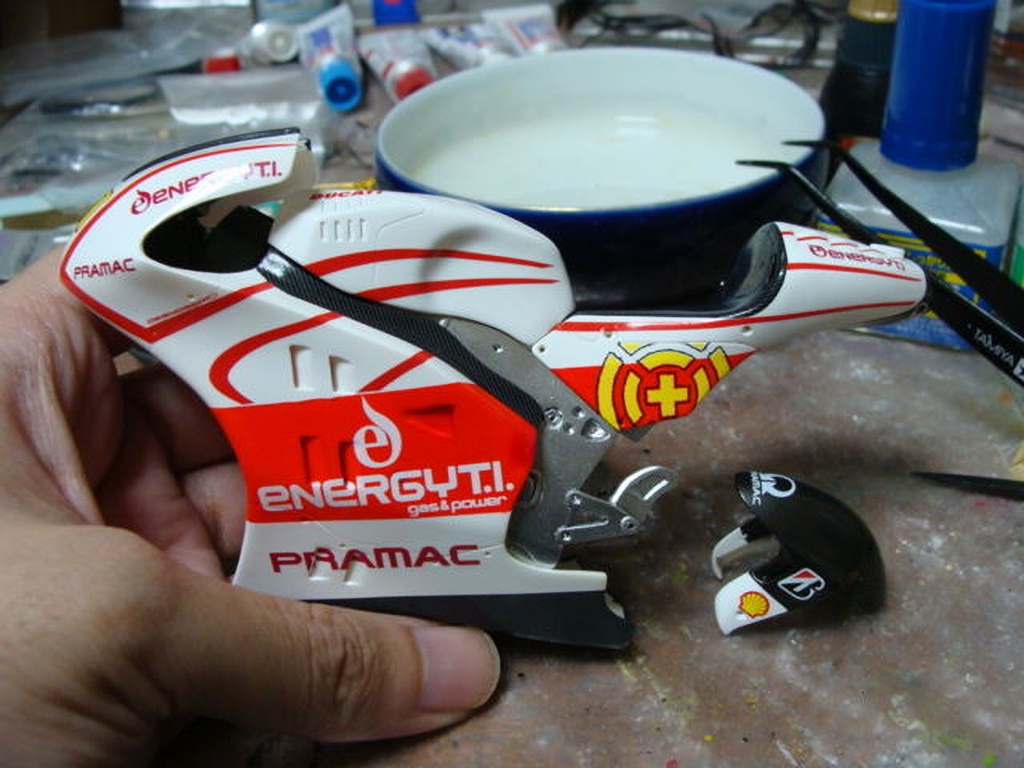 2013/11/06 デカール貼ってます。 実車画像を見ながら貼ってますが、インストの指示と合致する実車画像がなくイマイチ困惑。 アッパーカウルのフレームにかかる部分が実車はちょっと黒っぽかったので、GP12の余ったカーボンデカールを貼ってそれっぽくカットしてみました。 |
