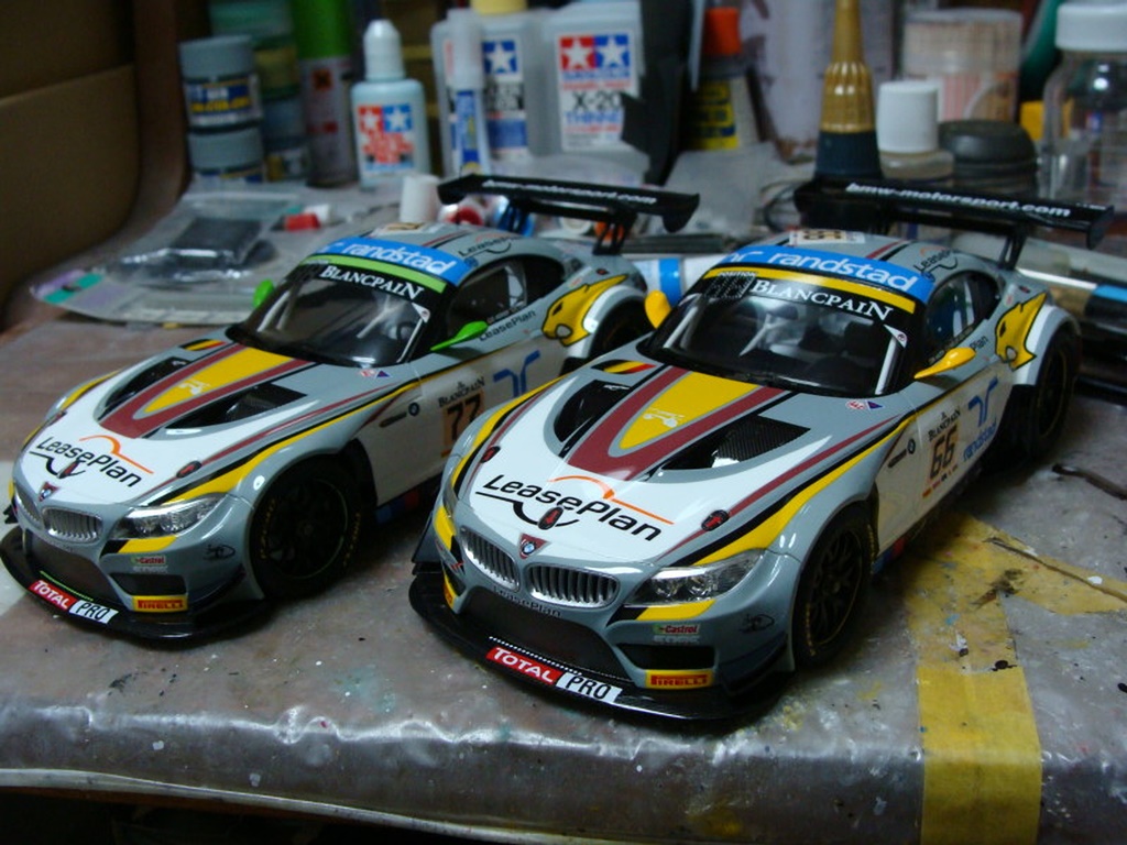 室内を作って、ホイールのラインデカールも何とか貼りました。 ホビーフォーラムで並べて気付きましたが、簡単に貼れた記憶のあるIceWatchのZ4とホイールが違っています。 あれは2013のキットを使いましたが、リムのサイド部分が平らになっていて、こっちは斜めに角度が付いてます。 |
