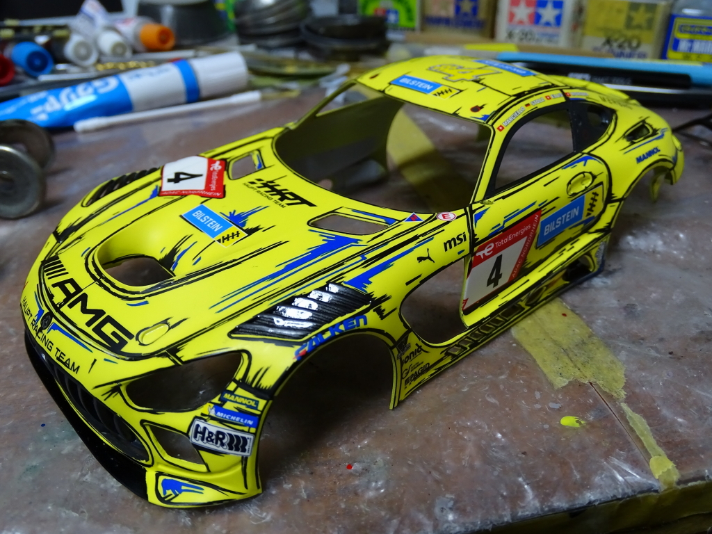 今回はSKデカールを使って、2023年のスパ24時間に参戦したチームビルシュタインのAMG GT3 Evoを作ります。 Evo化キットは今回もZoomOnのフォグライト付きを使います。 |