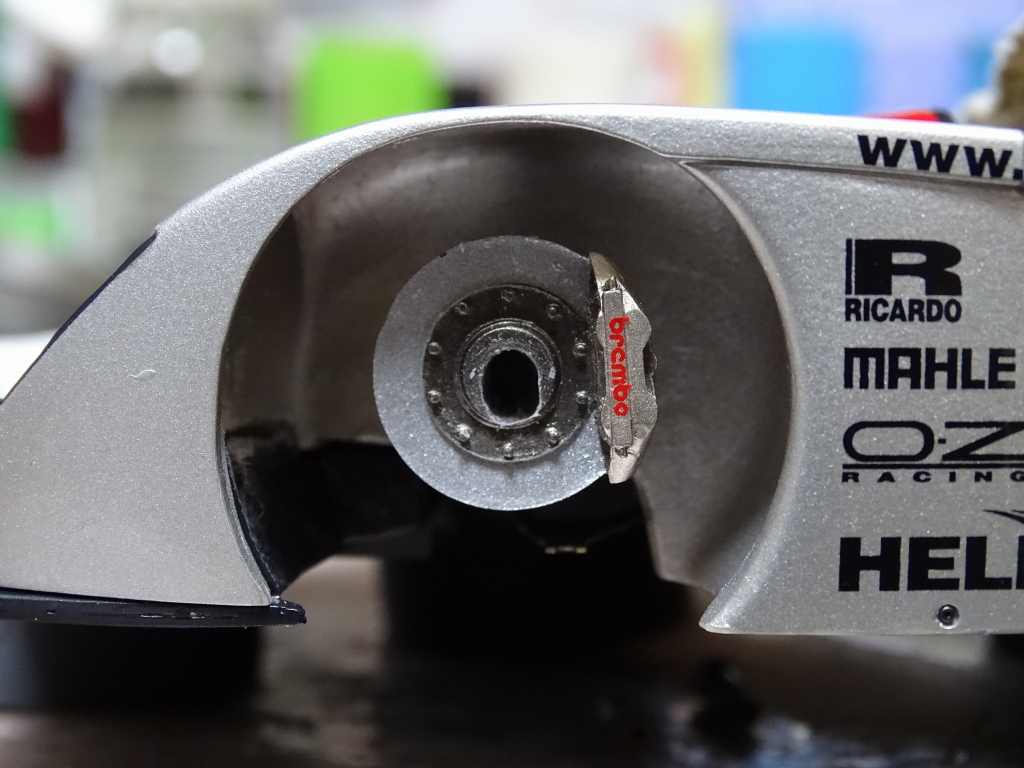 ちなみに、なぜか左フロントタイヤの車軸が全然合わなかったので、こんな感じで削って入れました。 それでもちょっと浮いてたみたいで、3点接地になってカタカタ言います。 |
