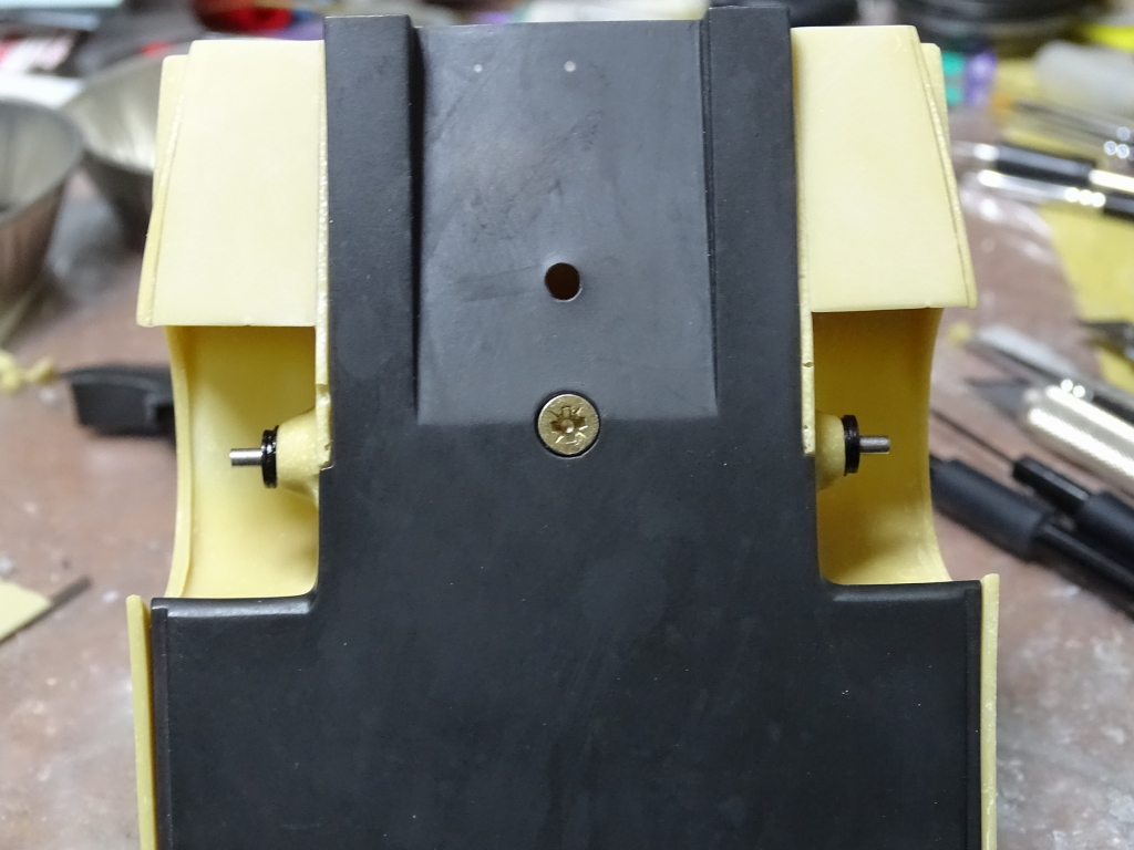 今回もフロントタイヤは位置が合わないので、ブレーキごとホイールを差し込む黒いパーツを、前回同様位置が合うように下に広げたり幅を詰めたりなどしました。 |