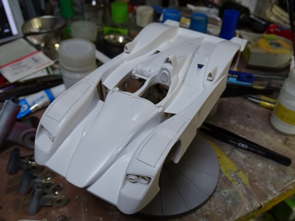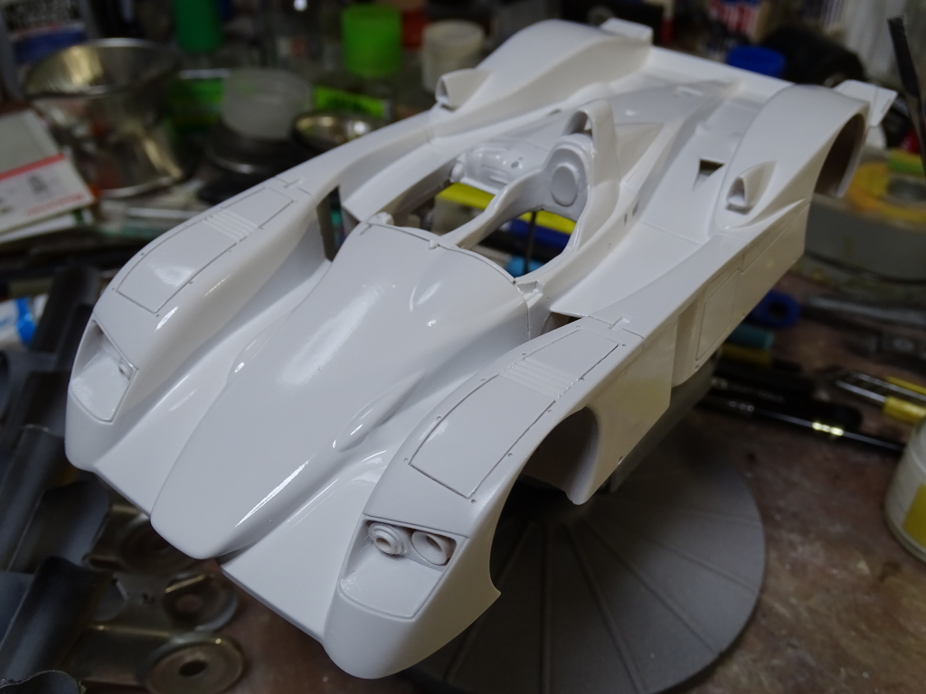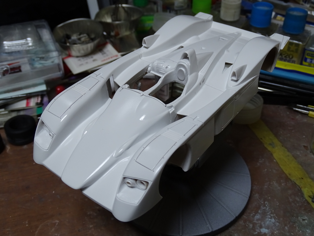 いつも通りにボディのバリ取り、仮組みを行い、全体に600番のスポンジペーパーをかけました。 |