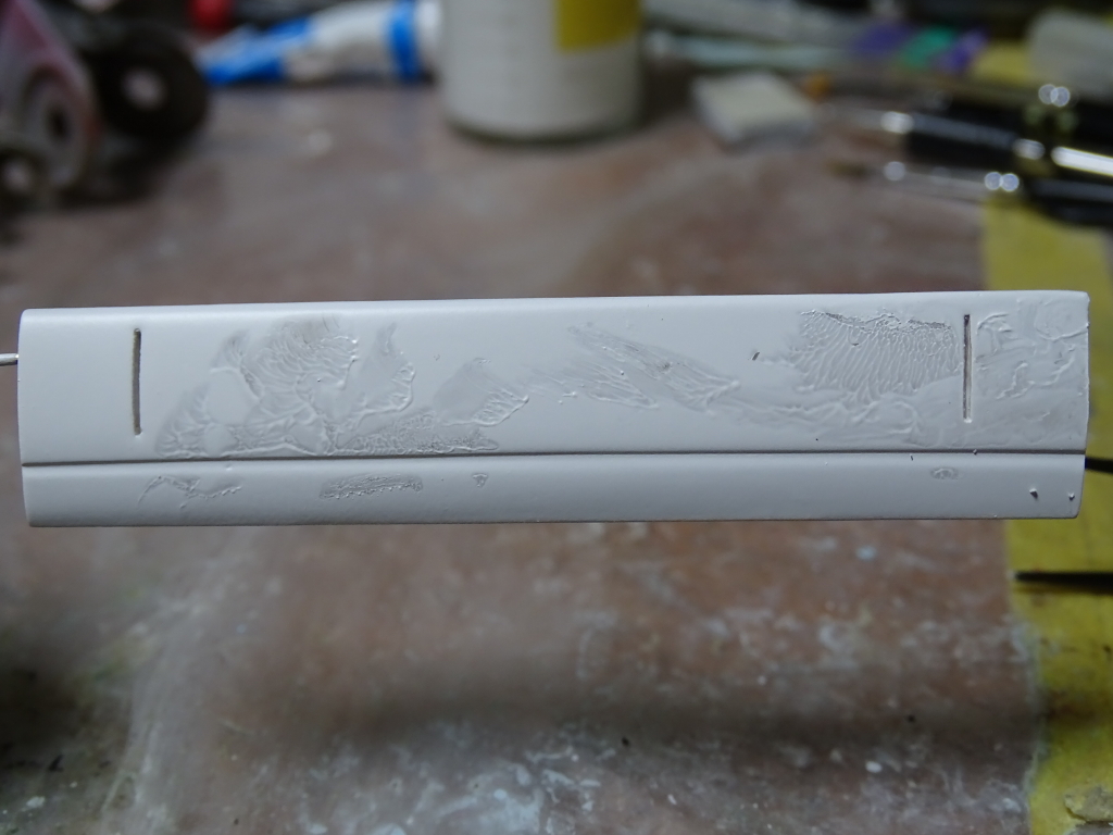 リアウイングは前回同様に幅が74mmになるように左右をカットして白サフを吹いたのですが、塗装直後に倒してしまい下側が大変なことになってしまいました。 |