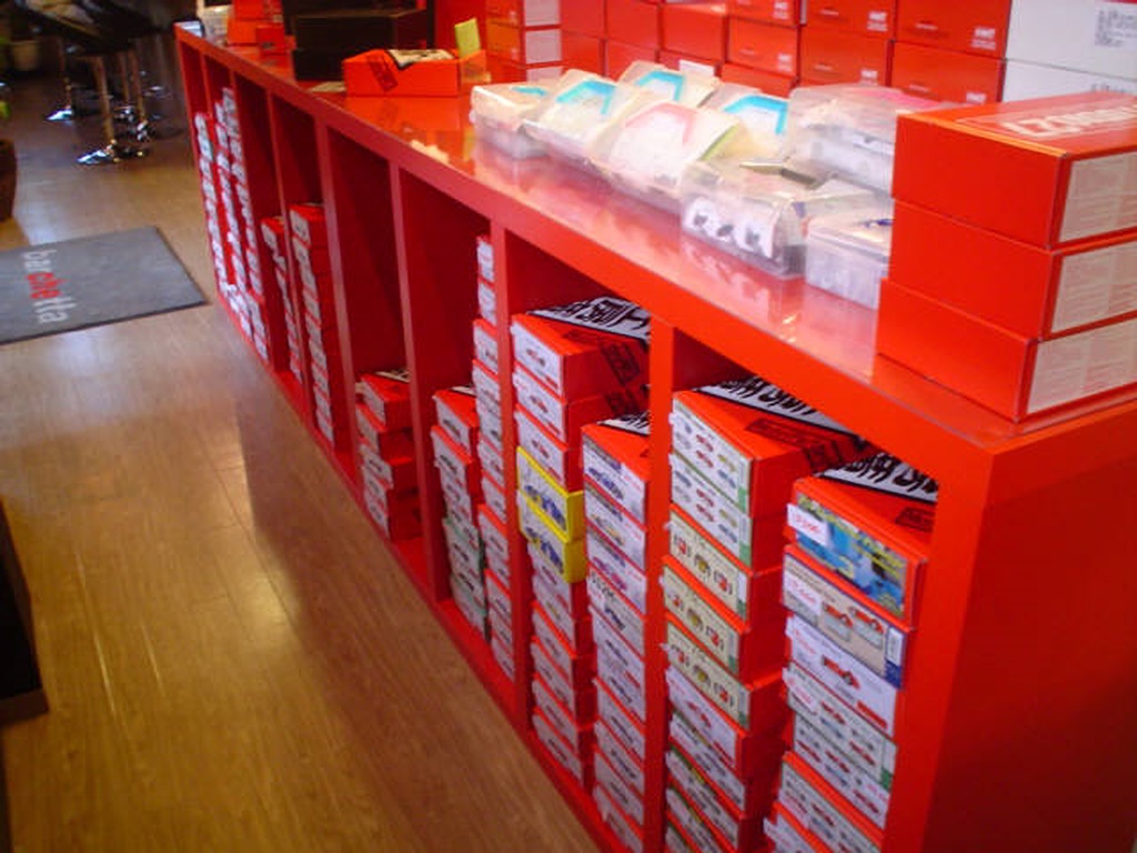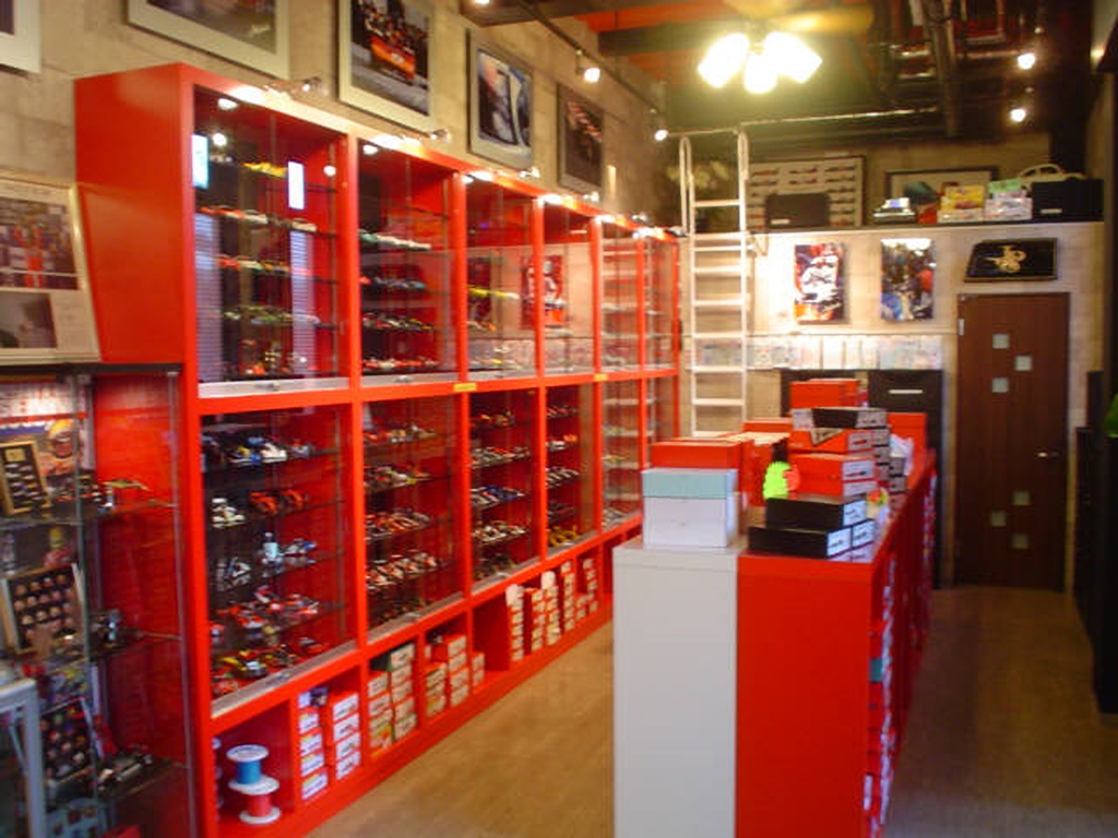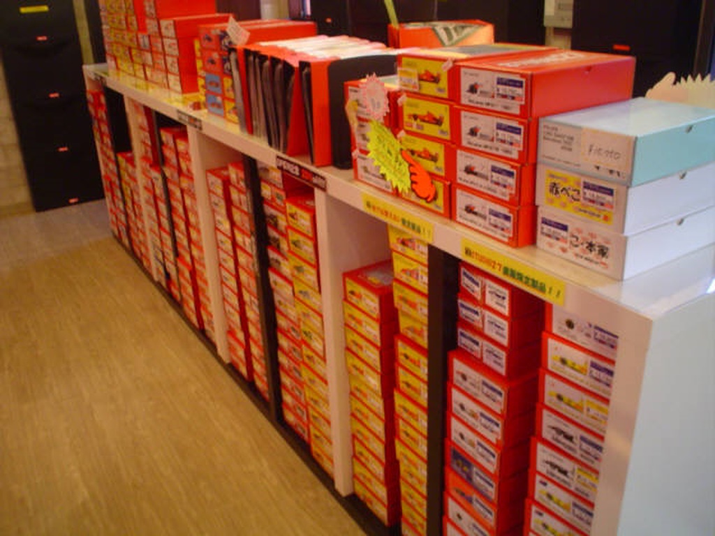 オープン時で棚には約300の完成品が並んでいるそうです。 新製品が出ればどんどん完成品は増えていくとの事ですが、既に飾る余裕はあまりなくなっています。 |