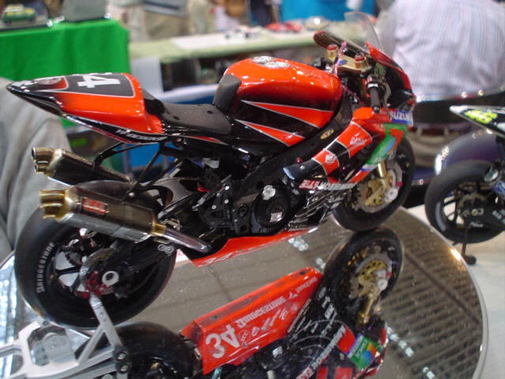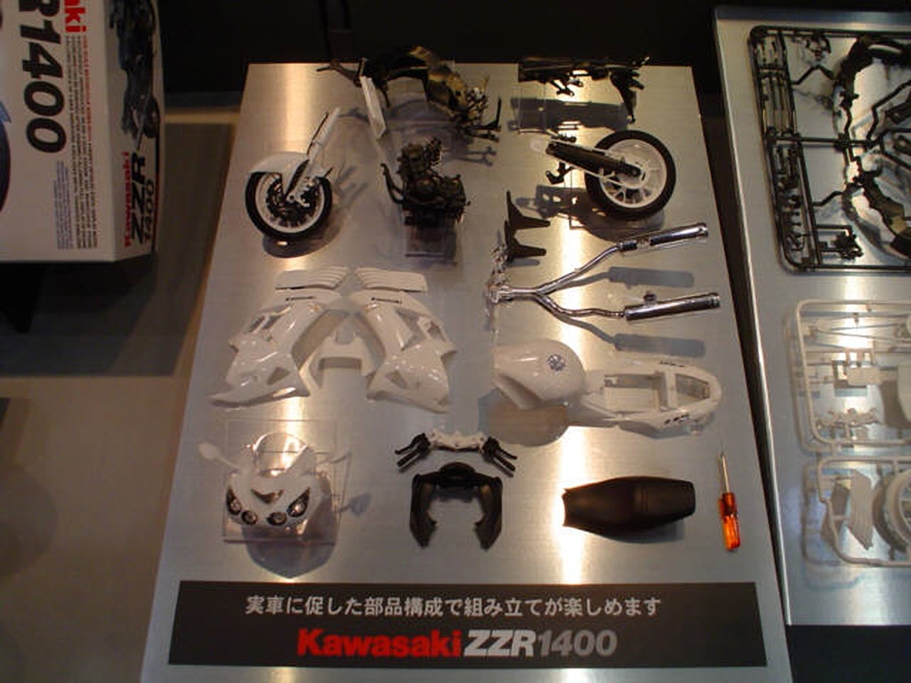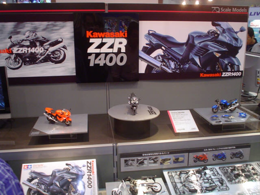 タミヤのブースです。 ありましたよ、5月末発売のZZR1400。 シングルシートやアンダーディフューザーなどの組み合わせで3種類の仕様が作れるそうです。 もちろん3種作る予定です。 |