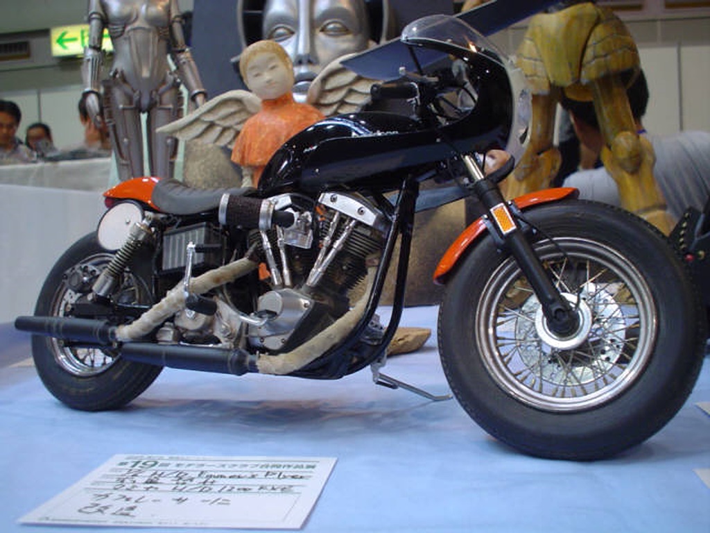 しかしこのハーレーカッコイイです。 タミヤの1/6のキットをベースにカフェレーサー風に改造してるのですが、改造のセンスがいいですね。 |