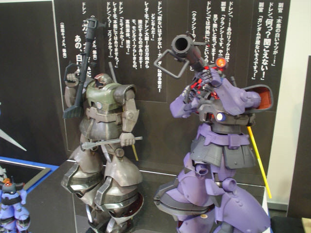 ここは前回もガンダムのセリフを書いたボードの前にグフを作ってたブースですね。 この展示の仕方も上手いですね。 |