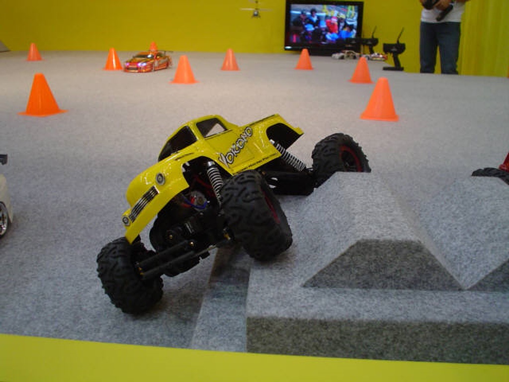 こちらはヨコモのブース。 相変わらずドリフトマシンのラジコンの実演をやってましたが、今回はどんなところでも走破出来そうなサスを持つバギーも走ってました。 前回の壁のような傾斜を上っていくラジコンの発展型かな? |
