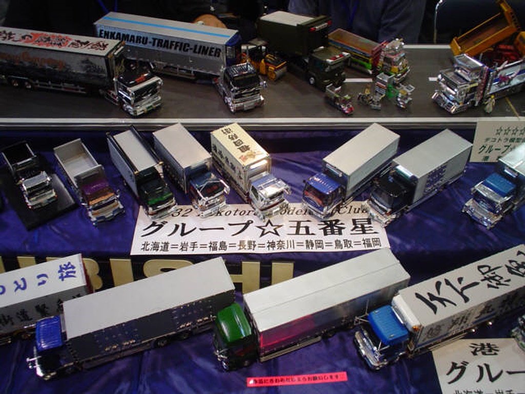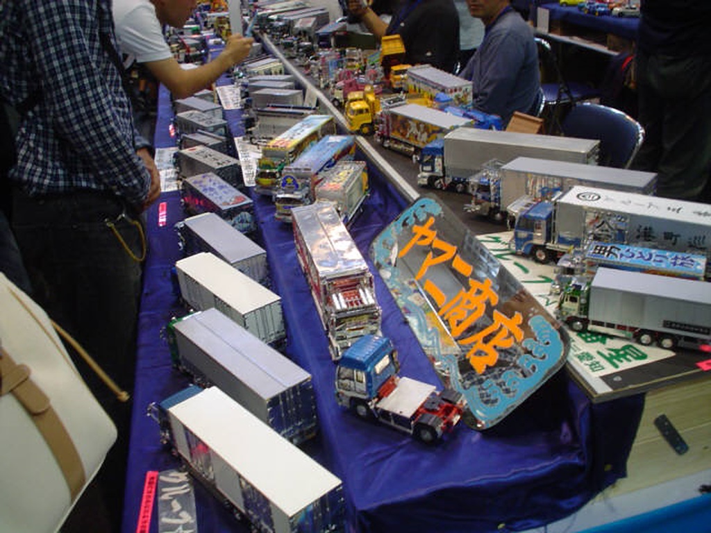 隣のデコトラ模型倶楽部(仮)さんのブースも入れると、凄い数のトラックが並んでいます。 |