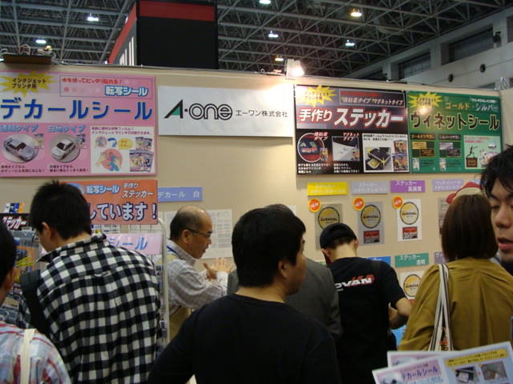 こちらはタミヤブースの前にあったエーワンという会社のブース。 インクジェットプリンタで作れる自作デカールを売り込んでました。 550GTで貴重なデカールをクリアともども引き剥がしてしまった私としては、ちょっと気になるものでした。 |