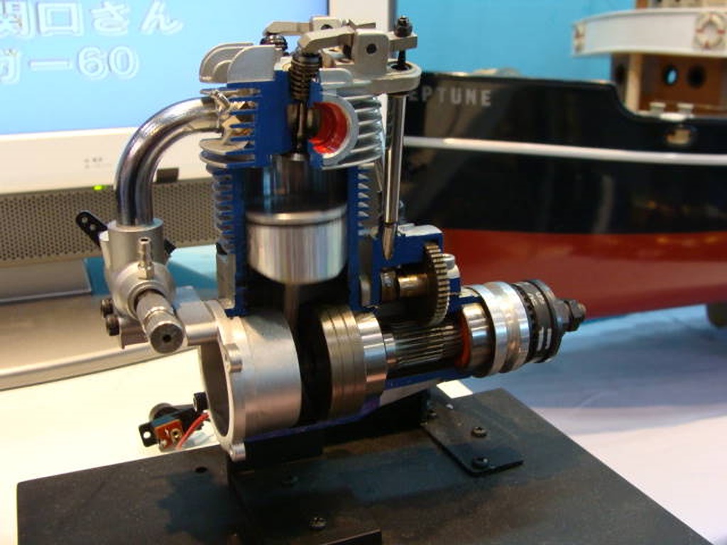 ラジコンエンジンを扱う斎藤製作所では、4ストエンジンの動くカットモデルがありました。 出力軸がカムを駆動し、プッシュロッドを介して吸排気バルブを稼働させるOHVエンジンの仕組みがよく分かります。 |