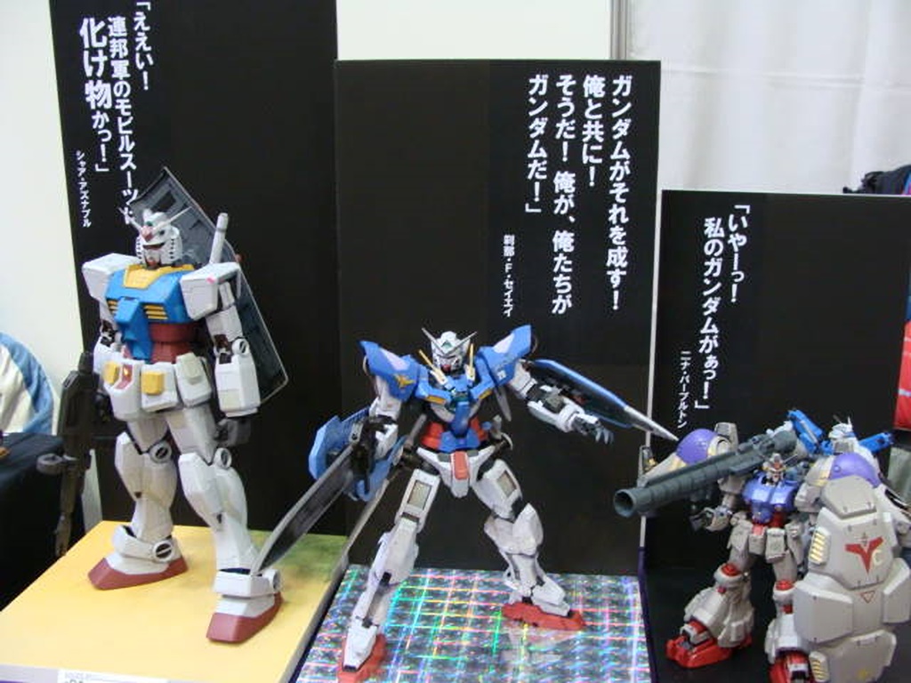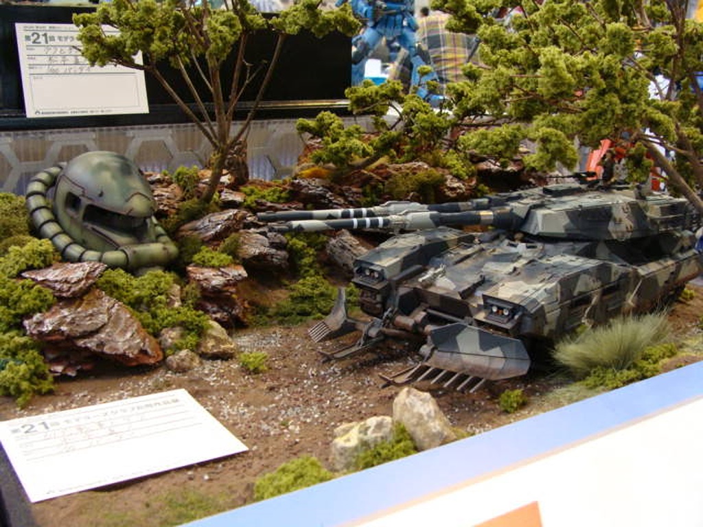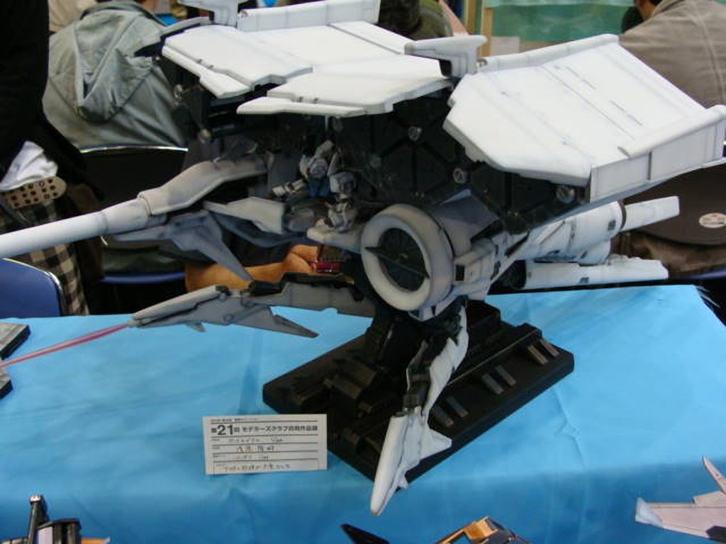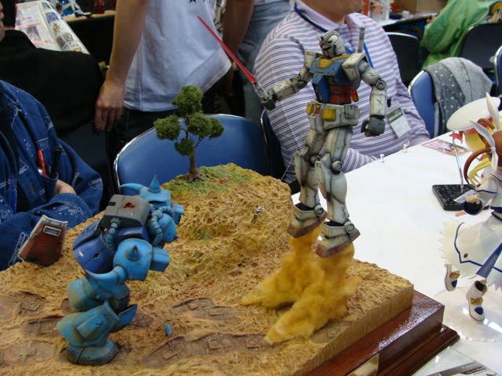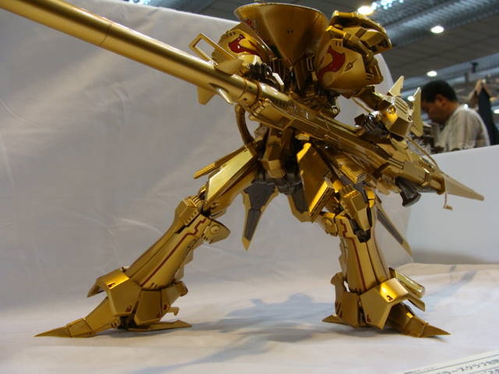 この展示展では珍しいFSSもの、ボークスのナイトオブゴールドがありました。 砲身長すぎて画像に収まりきりません。 私は素立ちのキットを持ってますが、バスター砲発射形態も思ったより良いですね。 |