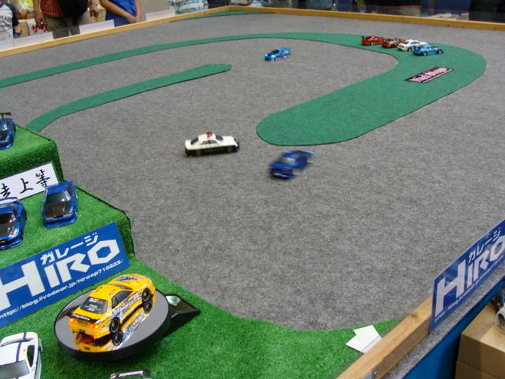 毎年ドリフトマシンのラジコンを走らせているところで、毎年見入ってしまいます。 追いかけているパトカーも見事にドリフトしてます。 |