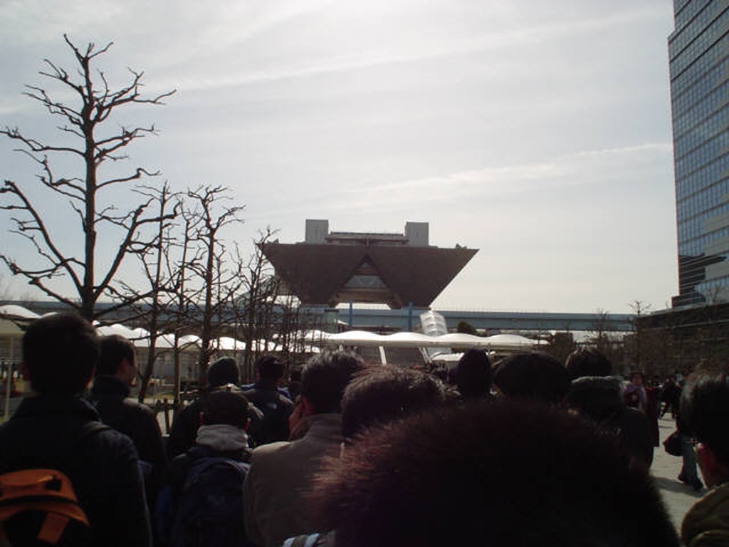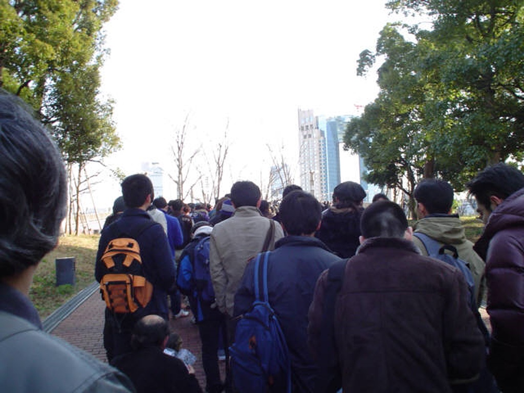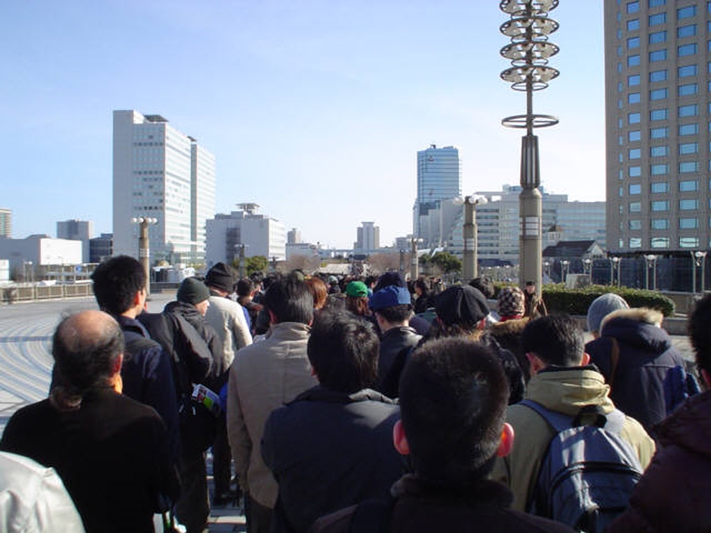 今回はガイドブックを買いそびれていたので、ビッグサイト前で買ってから列の最後尾へ行くのですが、駅前でもうこの人数です。 |