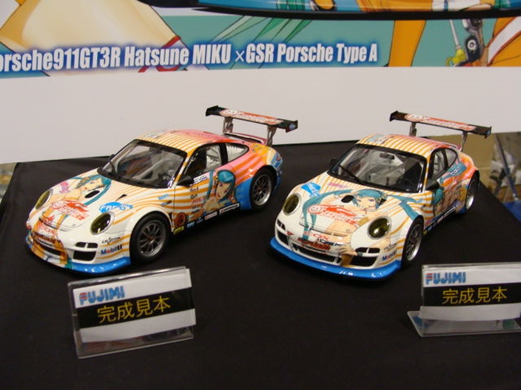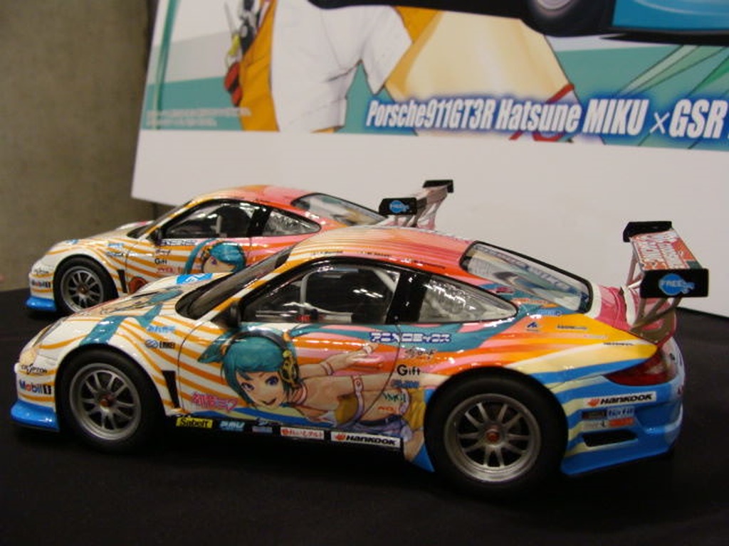そのミクポルシェですが、メーカーブースの隅にそっと展示してありました。 997GT3Rって車種は魅力的ですが、ミクには興味なし。 が、全面ミクデカールのおかげで出来が良いのか悪いのか判断できないです。 |