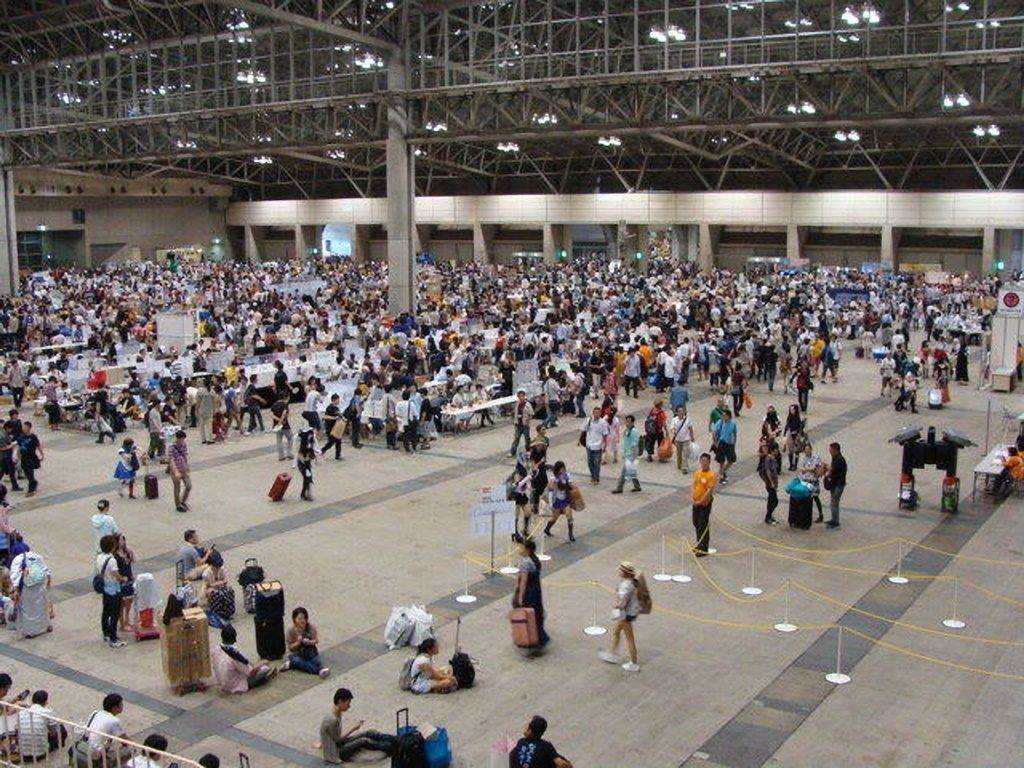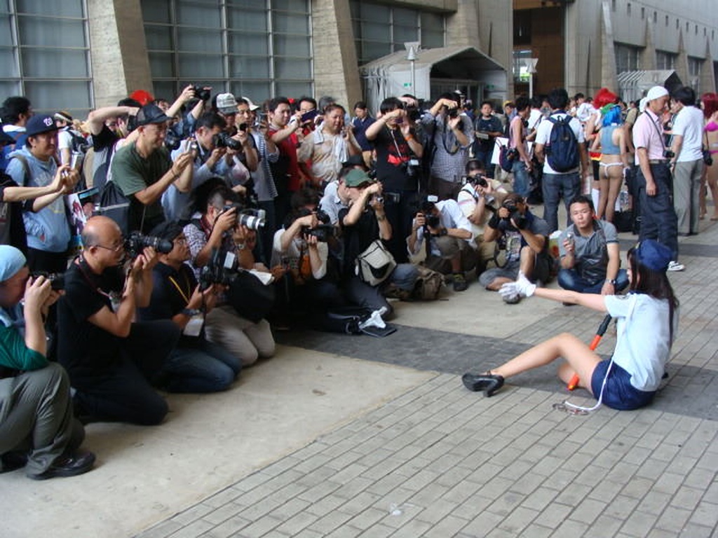 企業ブースの帰り道で見たコスプレさんの撮影会。 カメラを構えたおっさん達、異様です。 右奥にはふんどし娘がいますね。 |