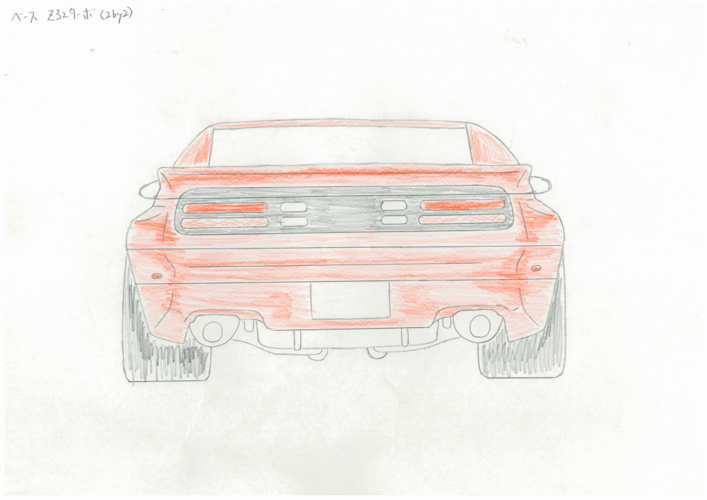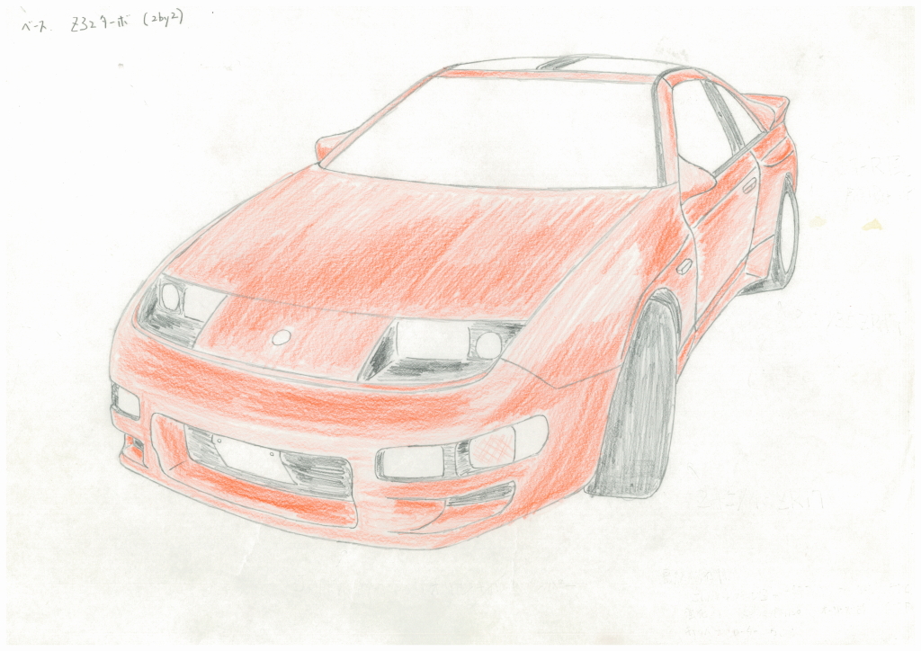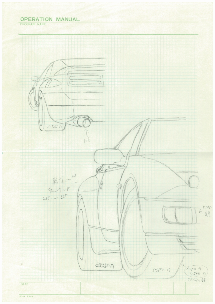 実はタービン交換した直後くらい(1993年ごろ)に最終目標をイメージして描いた絵が出てきたので、現状と並べてみました。エンジンは鍛造ピストンとコンロッドを入れて3.1リッター化し、トラストのTD06L2-20Gツインを組んで、ワンオフでワイドボディ化したいと思っていました。